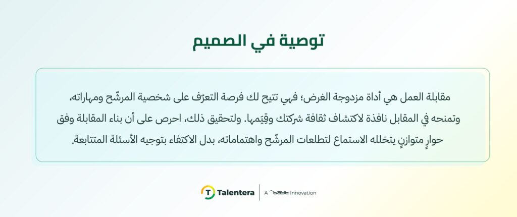 تُعرفك هذه المقابلات على مدى انسجام المرشح مع ثقافة الشركة، وتمنحك مؤشرات واضحة على مستوى ذكائه الاجتماعي والعاطفي وقدرته على ترسيخ علاقة مهنية بنّاءة. وقد ترى أن مقابلة مباشرة واحدة تكفي أحيانًا، في حين تقتضي بعض الأدوار -بحسب حجم الصلاحيات وتعقيد المسؤوليات وتسلسل الموافقات- إجراء أكثر من مقابلة لضمان دقة الاختيار.