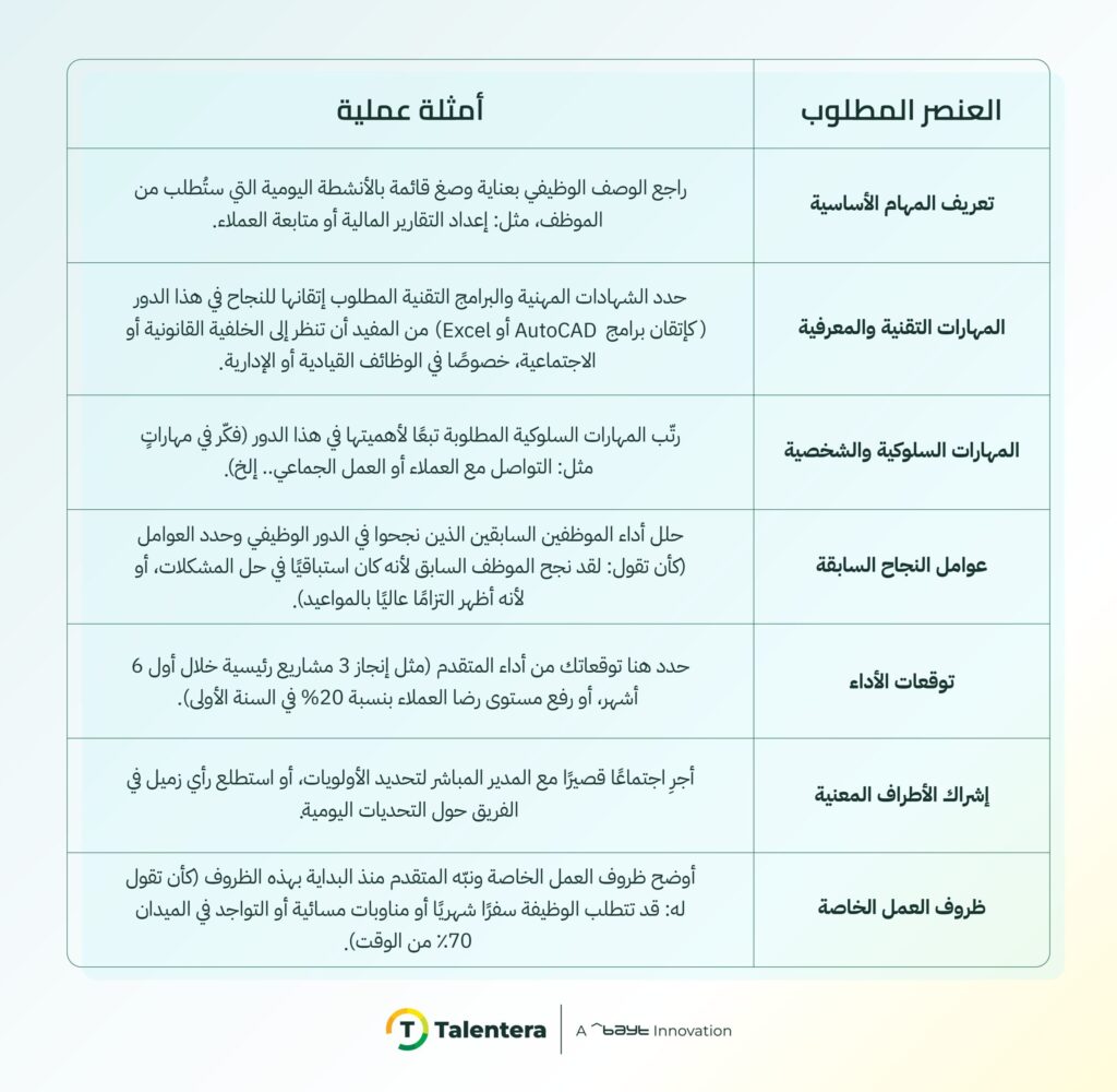 وبناءً على ذلك، خذ وقتك الكافي لتتعرف على أساسيات الوظيفة بعمقٍ وأجب: ما هي الواجبات اليومية والمسؤوليات الجوهرية لهذا الدور؟ ما القدرات التقنية والمعرفية اللازمة؟ وأي مهارات سلوكية أو شخصية تُعتبر حاسمة لنجاح الموظف؟