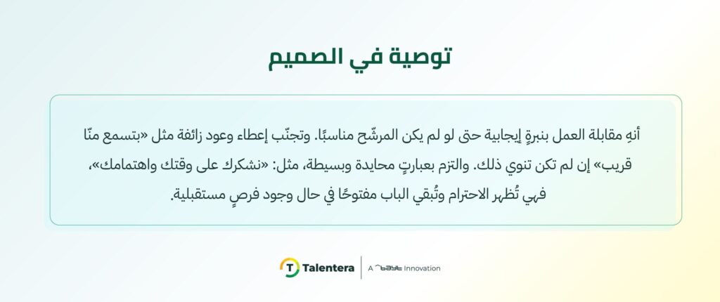 - اشرح الخطوات التالية بوضوح: قبل أن تُنهي المقابلة، وضّح للمرشّح ما سيحدث لاحقًا: أي متى سيتلقى ردًا، وما إذا كانت هناك مقابلات إضافية أو اختبارات أخرى، ولا تنسَ أن تُطلعه على الإطار الزمني المتوقع لاتخاذ القرار النهائي؛ لأن هذه الطريقة تمنحه شعورًا بالثقة والاحترام.