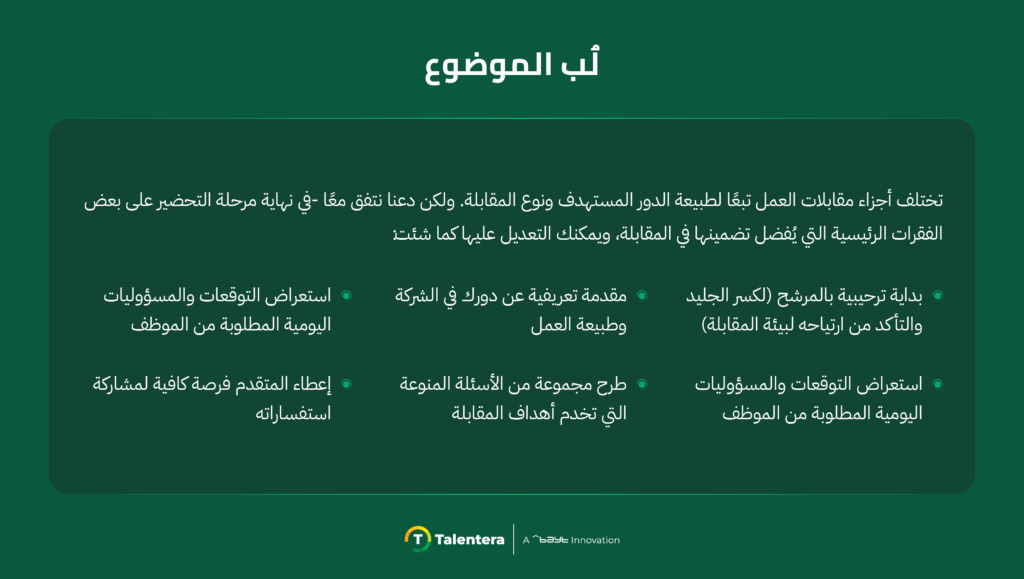 - ما نوعية الأسئلة التي تخدم الهدف من المقابلة؟ (فكّر في الأسئلة السلوكية أو التقنية.. إلخ).