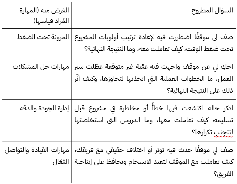 وبناءً على هذه المعطيات، من الأفضل أن تلتزم بالأسئلة التي تقيس الكفاءات مباشرةً من خلال سيناريوهات عملية، كأن تسأل: