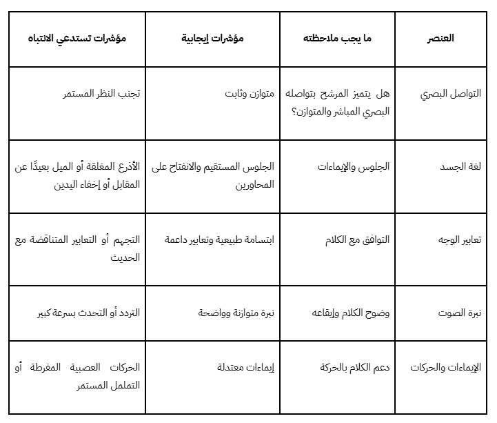 لا تكفي أسئلة المقابلات وإجاباتها لتكوين صورة متكاملة عن المرشح. فهناك جانب آخر لا يقل أهمية، ألا وهو: اللغة غير اللفظية، والتي تمثل مؤشّرًا خفيًا لكنه بالغ الأثر في كشف شخصية مرشحك وقدرته على التواصل ومستوى ثقته بنفسه، بل وحتى مدى انسجامه المحتمل مع بيئة الشركة وفريق العمل.