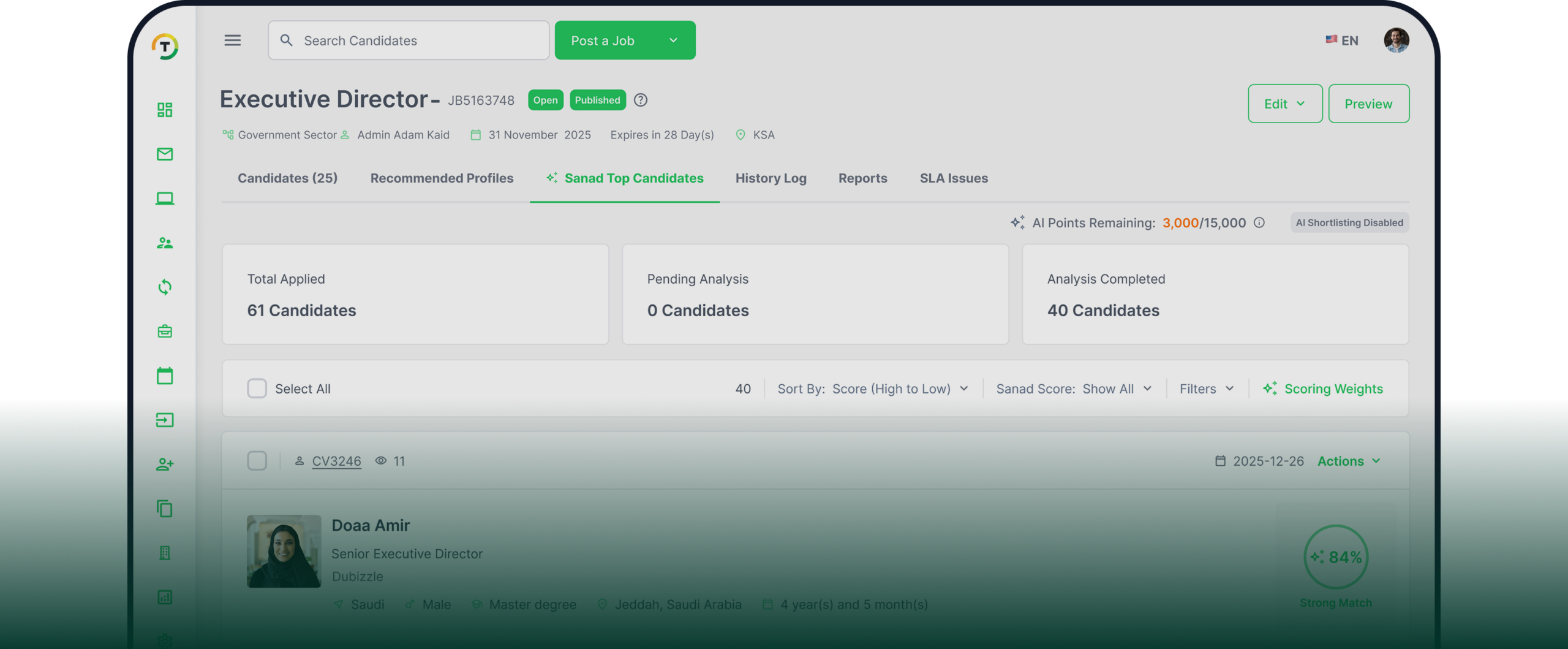 يُبسّط تالنتيرا التوظيف في القطاع العام مع ضمان شفافية مطلقة ومتابعة دقيقة للطلبات. يُمكّنك النظام من إدارة العمليات على نطاقٍ واسعٍ أو محدود تبعًا لهدفك، مستفيدًا من انسيابية الذكاء الاصطناعي مع إبراز البعد الإنساني، لتتوافق كل عملية توظيف مع احتياجات مؤسستك وإستراتيجيات القطاع الحكومي.